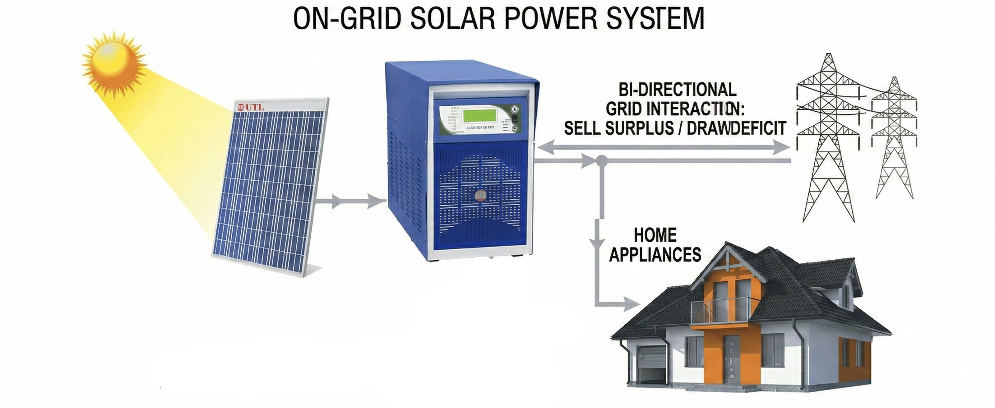 On-grid solar system directly electricity grid se connected hota hai. Isme battery nahi hoti. Jab solar power generate hoti hai, wo directly ghar me use hoti hai. Extra power grid me chali jati hai.